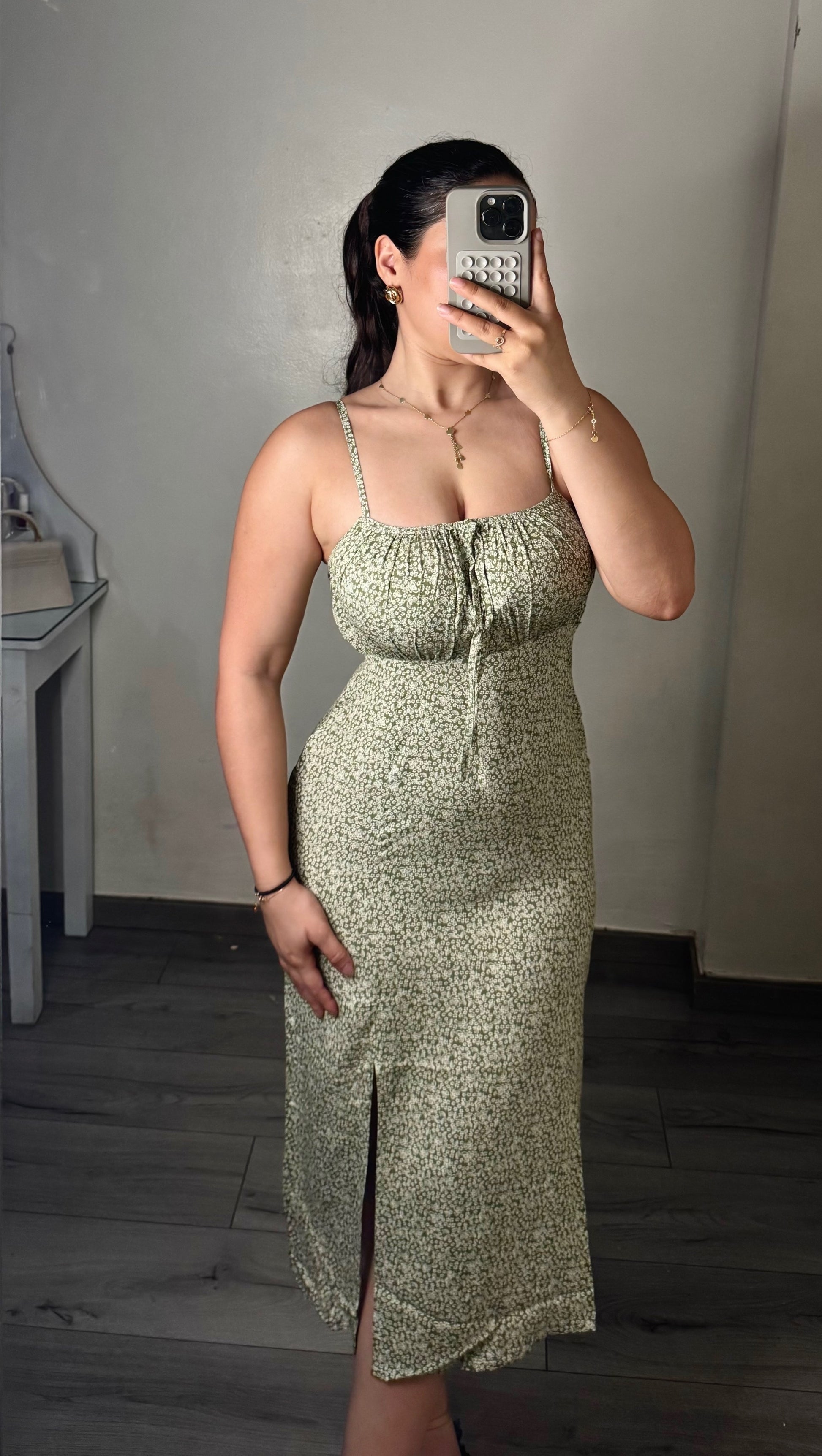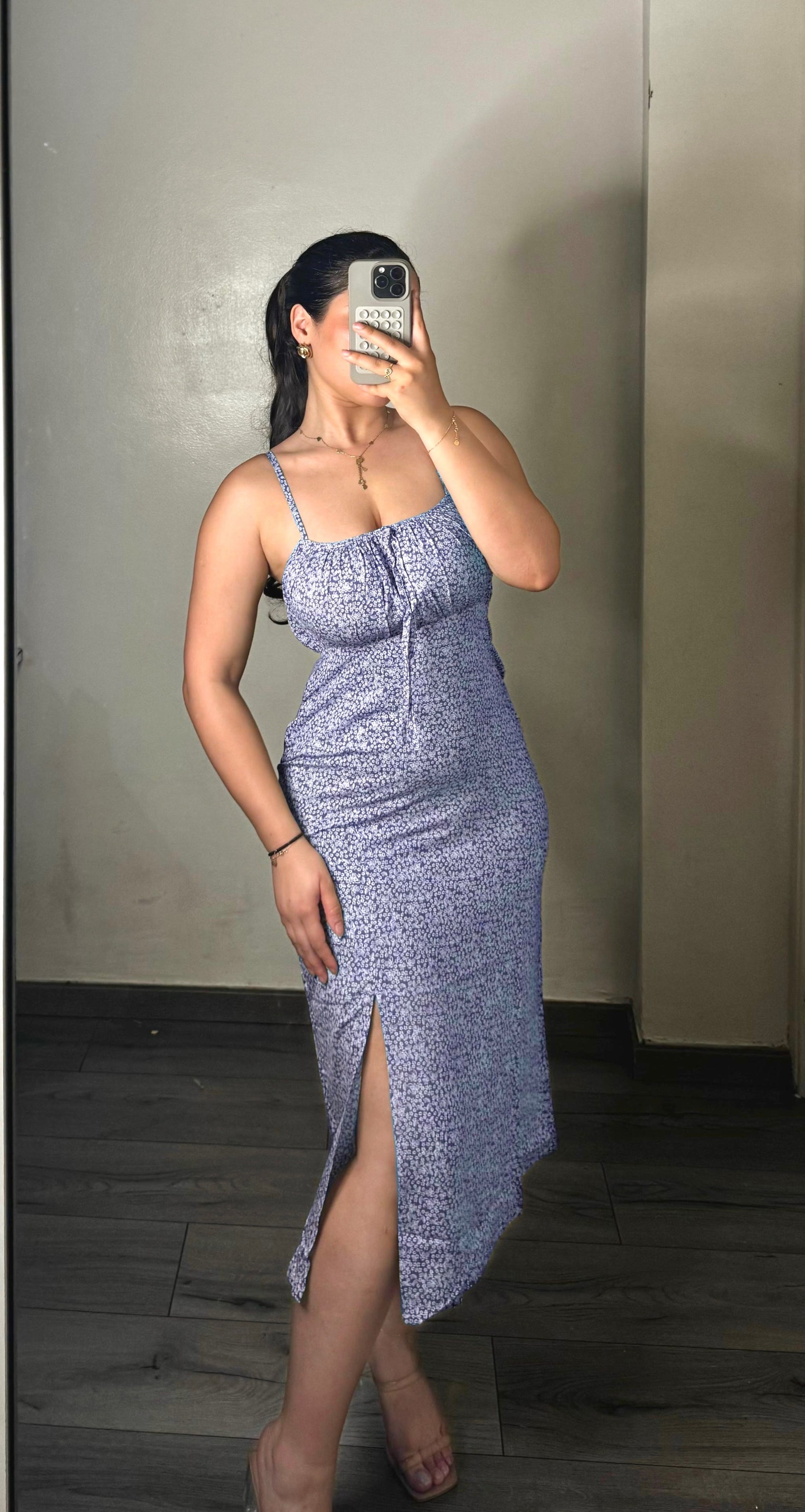 Sa coupe près du corps, sa fente élégante sur la jambe et son imprimé floral délicat lui donnent un charme naturel et féminin.